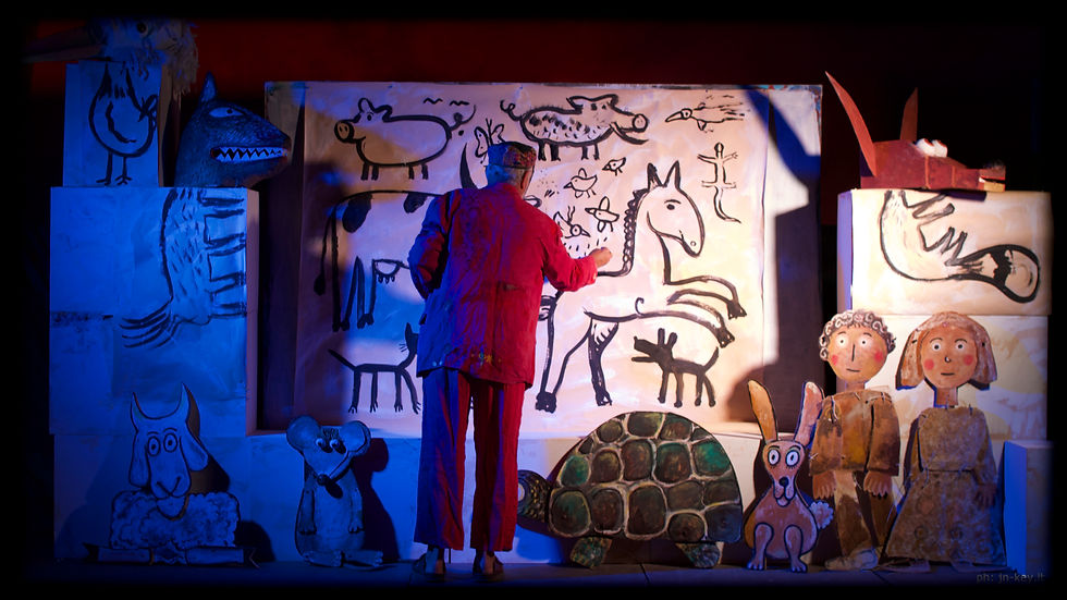 Noè racconta come tutto è successo tempo prima, gioca, modifica lo spazio scenico costruendo l’arca. Mostra gli animali, dipinti e animati in figure, con filastrocche e giochi di parole ne racconta la storia e le indoli, collegandole alla tradizione popolare, alla letteratura d’infanzia e al sapere comune.